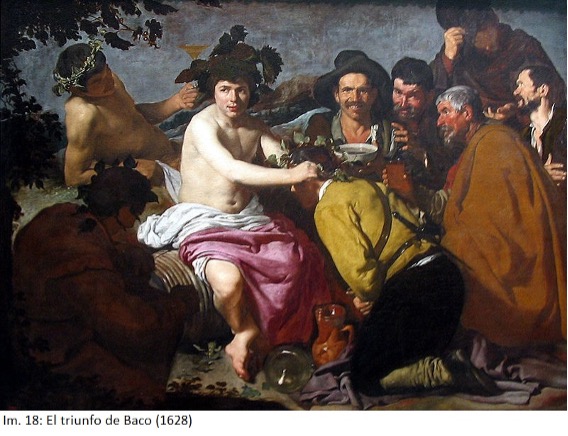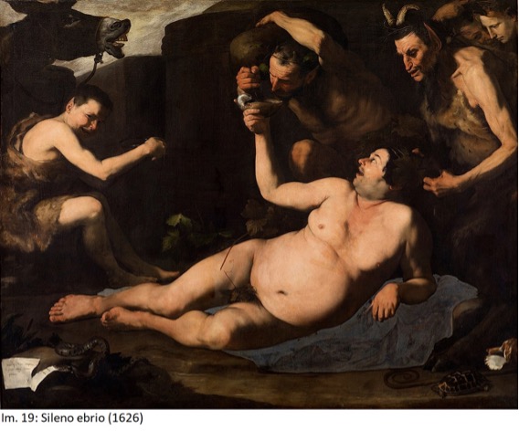 La incertidumbre empieza a habitar la época. Parece desestabilizar los estereotipos sociales y morales. Precisamente, “El triunfo de Baco” (Im. 18) de Diego Velázquez deja ver la prevalencia de elementos que tienden hacia la autorización de aquello considerado como “inmoral” o prohibido: la espontaneidad, el alcohol, la reunión entre campesinos amigos para beber, el torso desnudo del Dios Baco, las posturas que expresan descanso y la luminosidad que consigue resolver, hacen de este fabuloso cuadro una escena de liberación, de autorización al deseo. ¡Qué atrevimiento en la época autorizar el alcohol en los campesinos! En “Sileno ebrio” (Im. 19) de José de Ribera año 1626 también se observan elementos que permiten interpretar la idea de autorizar lo subjetivo, de la apertura a lo inquietante, interpelando lo hegemónico.