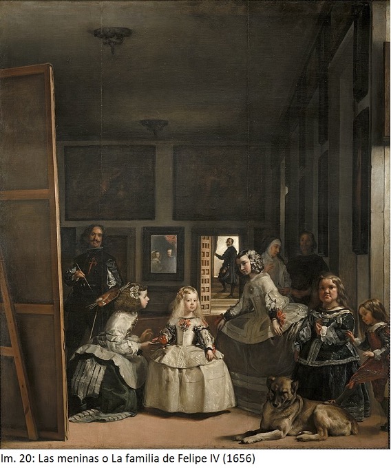 Otra obra de Velázquez que da lugar a lo subjetivo es “Las meninas” o "La familia de Felipe IV” (Im. 20). Pintada en 1656, compuesta por líneas que no terminan de cerrar y de definir las figuras, el cuadro otorga espacio para la construcción personal. Las personas se encuentran haciendo algo, hablando, o en alguna acción que aún no termina, lo cual resalta la sensación de movimiento, inconclusión y gestualidad. La escena guarda cierta espontaneidad que se expresa en la representación del perro, opuesto a lo preestablecido y rígido. El uso de claroscuros dando valores más claros a la imagen central señalada por la nena y valores más oscuros a los alrededores orienta la lectura del cuadro. Lo oscuro nos habla de lo no accesible, de lo conflictivo. Empiezan a aparecer elementos que dan cuenta de un periodo artístico que abre lugar a la interpretación, como la puerta que se abre al final con el hombre que no se sabe si entra o sale a la escena y que no tiene una relación directa con la misma.