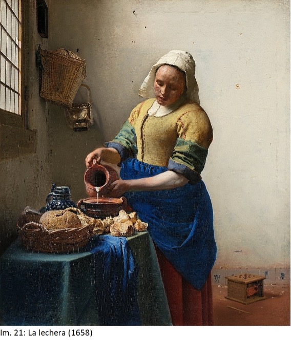 La dimensión protestante del Barroco (Lutero y Calvino) promovió el crecimiento de la burguesía que emergía en la grieta que se iba produciendo por los abusos de la organización política monárquica. Esto dio lugar a la independencia de los pedidos de artes visuales de las demandas religiosas por lo que aparecen nuevos géneros: naturaleza muerta, retrato, género costumbrista y paisaje. El género constumbrista fue bien representado por un pintor barroco, el holandés Johanees Vermeer, que pintaba los hábitos cotidianos de gente común. Vermeer se anima a mostrar la idea de lo íntimo, lo burgués, lo cotidiano, personas comunes en situaciones intra-casa, en vez de pintar los cortesanos. En “La lechera” (Im. 21) año 1658 se ve a una burguesa en su casa realizando sus quehaceres cotidianos. El centro de la escena es la realidad sencilla y no la idealización.