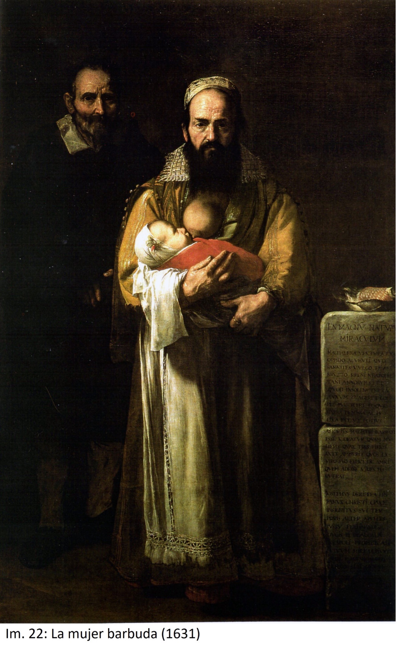 En el siglo XVI la asociación de estos aspectos con lo femenino era sinónimo de horror. Lo que hace el Barroco es introducir la identidad de tales aspectos con la mujer como cosa valorable, cosa notable. La mujer disfrazada de hombre, que puede despertar la atracción de otra mujer, empieza a cobrar un valor de interés, en vez de desprecio, gracias al arte Barroco que empieza a tomar esta tensión entre la posición mujer y sus deseos como argumento teatral. En tal sentido, el cuadro de Ribera “La mujer barbuda” (Im. 22), de una figura humana de aspecto masculino, con caracteres sexuales masculinos, pero con mamas dando de amamantar a un bebé, es el producto de una época que introduce, por la vía del arte Barroco en el discurso social, a la imagen varonil de la mujer.