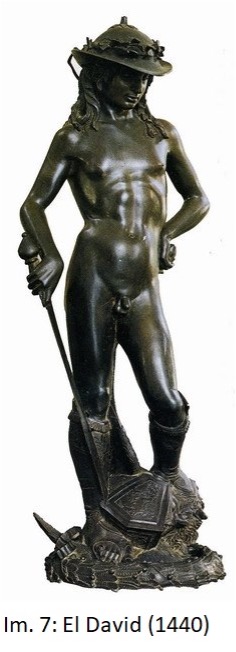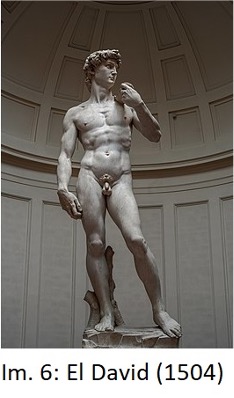 En Florencia (Italia), Leonardo da Vinci, Rafael Sanzio, Donatello y Miguel Ángel Buonarotti, entre otros, son representantes de este periodo. Es el momento de la escultura más famosa de Miguel Ángel Buonarotti, “El David” (Im. 6). Realizada a principios del siglo XVI por encargo de la catedral de Florencia, representa a David, rey bíblico, en el momento previo a enfrentarse con Goliat. Su tamaño imponente, el nivel de detallismo, la piedra que lleva en su mano y la historia victoriosa que cuenta, son claros elementos del poderío que pretendía instituir la República de Florencia en aquel entonces cuando se disputaba el territorio contra el rey Carlos VIII de Francia, cuestionando la obediencia a Roma y reafirmando su autonomía[5].