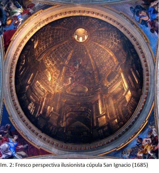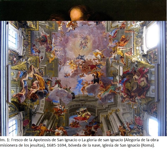 Como dice Nusenovich "los jesuitas le daban una gran importancia a la emoción para comunicar ideas religiosas"[12]. El propio Pozzo era jesuita. Se trata de la provocación al encuentro con los afectos por medio de las artes ilusionistas. Pozzo realiza este fresco (Im. 1) en el techo con una perspectiva impresionante porque parece una azotea adornada por estatuas a pesar de que el techo es plano. Da la impresión de una idea de movimiento en una superficie inmóvil. Se trata del conflicto entre realidad y representación, en lo cual no se advierte claramente cuáles son los elementos reales y cuáles los pintados. En la misma iglesia Pozzo pinta en la cúpula otro impresionante fresco (Im. 2) en el cual la luz viene de Dios padre al hijo que la transmite a San Ignacio mientras se rompe en cuatro rayos que conducen a los cuatro continentes hasta ese momento conocidos. Pozzo explica que ilustra las palabras de Cristo del evangelio de Lucas: “Me mandan para enviar el fuego en la tierra” y las palabras de Ignacio: “Se volverá todo en llamas” mientras otro rayo ilumina el nombre de Jesús[13].