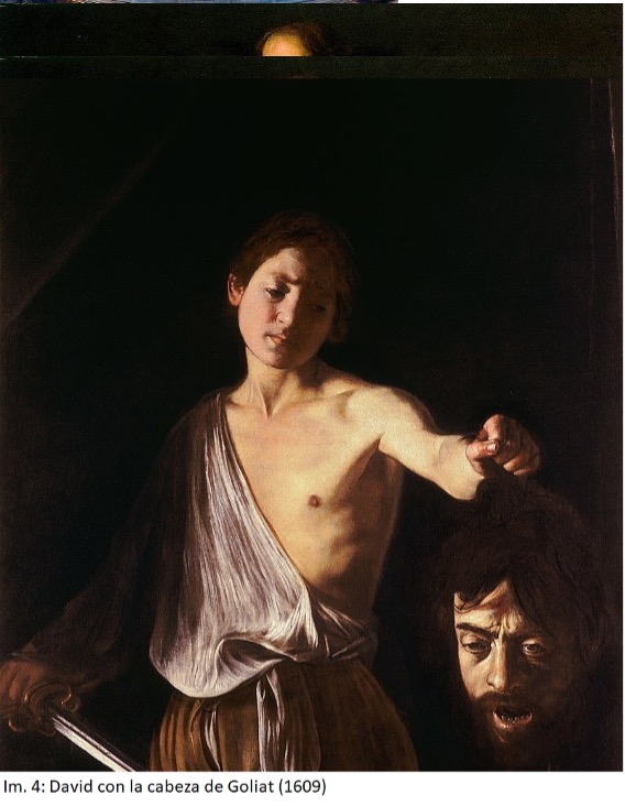En otra pintura del mismo autor del año 1609, “David con la cabeza de Goliat” (Im. 4), el uso técnico de los claroscuros configura una luminosidad enfocada en la figura central, David, y en la cabeza de Goliat, lo cual remite a la ambigüedad. En esta obra, Caravaggio expresa la osadía del héroe bíblico "en un momento de inmenso patetismo, con la cabeza del gigante vencido tomada por los cabellos y la espada en la otra mano"[15]. El dramatismo temático del barroco es acompañado por recursos formales y técnicos, como los claroscuros, el uso de la luz, la figura de frente y abierta, el espacio indefinido, que va comunicando la afectividad al espectador y configurando una representación de gestualidad con una rigurosidad técnica con la que tramita de manera elocuente el agotamiento de los ideales absolutistas e introduce una nueva manera de mirar el arte.
