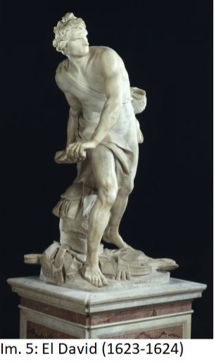 Por su parte, el arquitecto y escultor Gian Lorenzo Bernini, es otro símbolo del Barroco. El momento en que David arroja la piedra es captado en la escultura (Im. 5) que Bernini realiza en el año 1623. Podemos ver a David con una actitud corporal en movimiento opuesta al David de Miguel Ángel, o al de Donatello (Im. 7), que expresan un clima de optimismo, tranquilidad y unidad corporal. Lo quieto esconde la tensión humana. Bernini abre esa tensión. Muestra al héroe en su dimensión humana pues se contorsiona por efecto de su esfuerzo físico en el momento de gran tensión en que arroja la piedra a Goliat. "Su rostro se contrae, sus pies se aferran con los dedos doblados al pedestal. El naturalismo idealizado ha cedido lugar al realismo [...]"[16].
