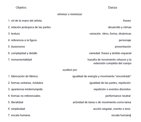 La distinción esencialista del minimalismo como nueva especificidad de las artes que se traslada del objeto a la danza en un ejercicio literal de traducción, la ejerce la misma Yvonne Rainer al escribir la famosa tabla comparativa o sistema de aplicación de los criterios de la escultura minimalista a la danza minimalista (su danza). De hecho, veremos que la bailarina define en esta tabla el concepto señalado por Mark Franko al establecer que lo que en escultura minimalista es la literalidad del objeto en danza será “la actividad de tarea o el movimiento-como-tarea”.