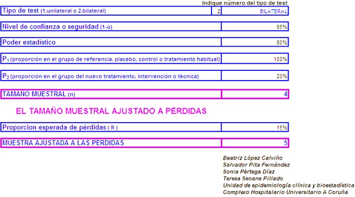 López, B., Pita, S., Pértega, S.P., Seoane, T. [Publicación en línea] «Cálculo de tamaño muestral». 2010. https://www.fisterra.com/mbe/investiga/9muestras/9muestras2.asp [Consulta: 6-10-2017].