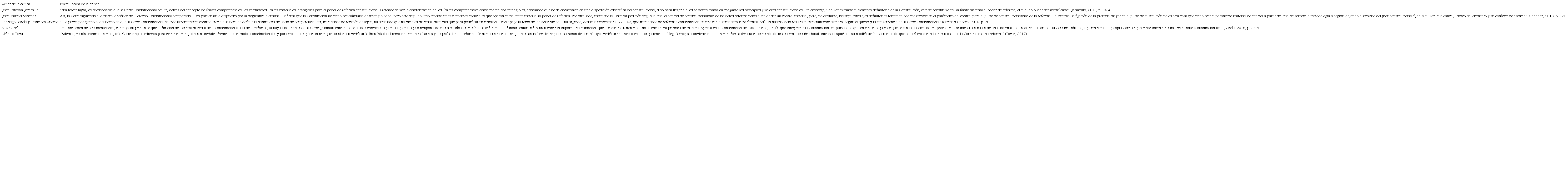 Muchos de los autores que han realizado abordajes teóricos frente al desarrollo de la teoría de la sustitución constitucional coinciden en señalar que, contrario a lo expresado por la Corte Constitucional, el juicio de sustitución constitucional es un juicio de naturaleza sustantiva y no meramente un asunto de procedimiento por competencia. La siguiente tabla 1 recoge la literatura que da una amplia aceptación a esta crítica de la postura de la Corte en esta materia.