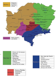 Para entender esta intensa concentración de la tierra en El Carmen de Bolívar, tenemos que remontarnos a los episodios de la violencia, cuando existieron a partir de la década de los noventa del siglo xx los siguientes actores armados (Alvis, 2017): Compañía Palenque del Bloque Caribe de las FARC-EP; la compañía Jades Jiménez del ERP; las Autodefensas Unidas de Colombia con la estructura Rito Antonio Ochoa; el frente Jaime Báteman Cañón del ELN; el bloque “héroes de los Montes de María” de las AUC.