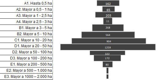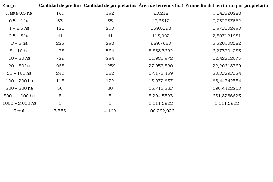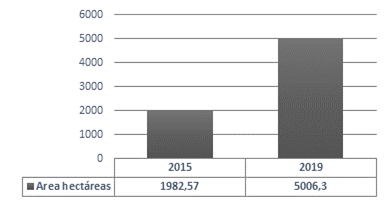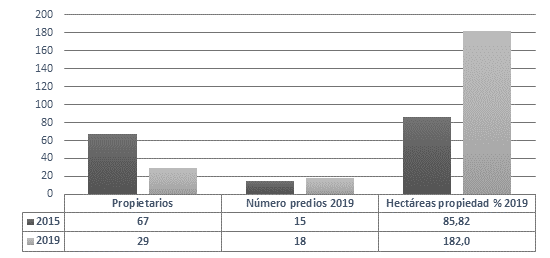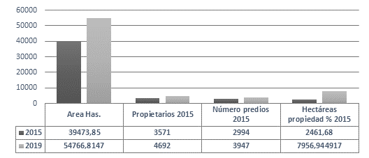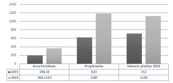 El análisis del número de predios debe ser complementado con su extensión, para no arrojar una imagen distorsionada de la realidad, según la cual un mayor número de predios representa una mejora en la distribución de la tierra. En efecto, cuando tomamos las propiedades inferiores a una hectárea, se incrementó su área total en 2015, de 196,3 hectáreas a 364,1 hectáreas en 2019. Por lo tanto, su crecimiento arroja como resultado un 85,4 %; mientras que el número de predios pasó de 712 a 1.130, un crecimiento de 58,7 %; y, por último, los propietarios pasaron de 623 a 1.187, con un incremento de 90,5 %.
