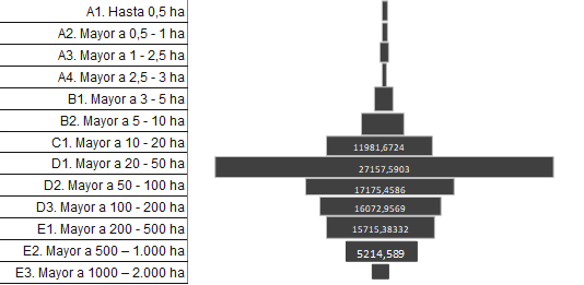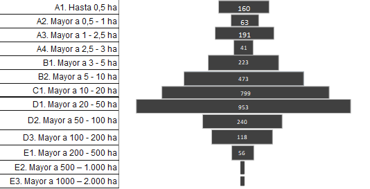 Otra gran diferencia entre los datos de distribución entre 2015 y 2019 es que el mayor propietario en 2015 poseía un terreno con un área total de 1.982,57 hectáreas. Mientras que para el año 2019 el mayor poseedor tiene una superficie de 3.707 hectáreas, como se puede evidenciar en la Figura 6.