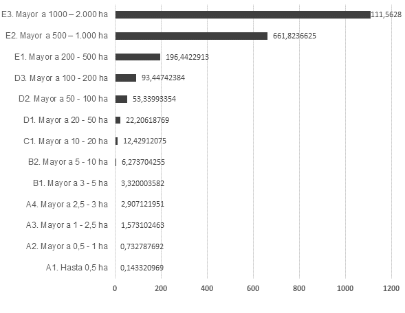 Por último, el promedio de hectáreas por propietario ratifica la alta concentración de la tierra en El Carmen de Bolívar (ver Figura 12). Los 1.259 propietarios en el rango entre 20 y 50 hectáreas poseen en promedio 22,206 hectáreas, área por debajo de la Unidad Agrícola Familiar para este municipio. Por otra parte, para el rango de 1.000 a 2.000 hectáreas, encontramos un promedio del territorio por propietario de 1.111,5 hectáreas, aproximadamente 50 veces más; es decir, que el propietario con mayor terreno posee 50 veces más que la media de los poseedores en El Carmen de Bolívar.