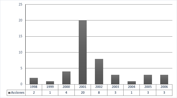 Entre 1998 y 2006 en María La Baja se desarrollaron aproximadamente 45 acciones violentas entre masacres, homicidios y secuestros selectivos. Con el punto más alto en 2001, cuando se realizaron por lo menos 20 actos violentos en contra de las comunidades de María La Baja, con el propósito directo de crear desplazamientos masivos acompañados por la acumulación de tierras. La Figura 2 ilustra las acciones violentas.