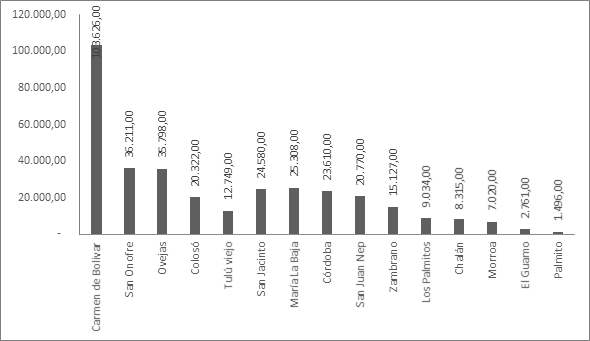 Continuando con el análisis de la distribución de la tierra en El Carmen de Bolívar, observamos como en la distribución de los terrenos por rango se concentra la tierra en los terrenos con mayor área (ver Figura 11). Esta dinámica ratifica la concentración de los terrenos en las grandes haciendas, manifestando la restructuración de la economía en El Carmen de Bolívar, que pasó de una economía familiar y agroalimentaria a una economía de agroindustria y grandes plataformas pecuarias.