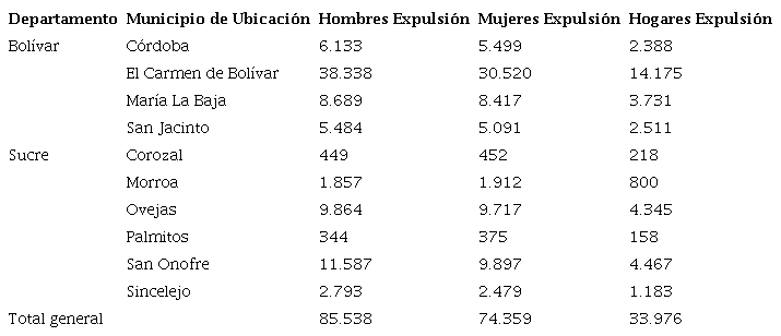 Otra condición que influyó en el desplazamiento de los campesinos fue la alta informalidad de la tenencia de la tierra, causada por la inexistente y pasiva institucionalidad estatal, lo que incitó a las tácticas de los ejércitos paramilitares al despojo (Juníeles, 2017, p. 17; Reyes, 2016, p. 233). El crimen del desplazamiento forzado en los Montes de María y en María La Baja alcanzó niveles especialmente altos: “[…] así, tenemos un total acumulado de 159.879 personas expulsadas de la región hasta el mes de julio de 2010. Los municipios más afectados son Carmen de Bolívar, San Onofre, Ovejas y María La Baja” (Cubillos, 2011, p. 62). La Tabla 2, sobre el desplazamiento en algunos municipios de la subregión de Montes de María, evidencia el grado de afectación por el conflicto armado. En particular, la táctica de guerra del desplazamiento por parte de las fuerzas paramilitares en donde tuvo una mayor afectación fue en María La Baja, con un desplazamiento de 8.689 hombres, 8.417 mujeres y en concreto 3.731 hogares desplazados, caracterizando la expulsión masiva y póstuma acumulación de estas tierras en pocas manos.