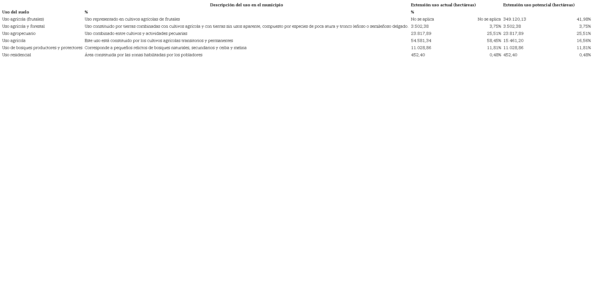 Así mismo, el territorio es utilizado para la cría de ganado, la industria avícola y la pesca, entre otros productos cárnicos o alimenticios; usos derivados de la alta calidad de los suelos y sus condiciones climáticas e hidrográficas, como lo ilustra la siguiente tabla (Tabla 1).