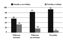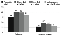 En la población total la tasa de pobreza es de 45%, cifra que en el grupo de niños y niñas de 0 a 5 años aumenta a 60% y en el de 6 a 11 años a 58%, siendo más de 10 puntos porcentuales mayor que la tasa de pobreza en la población total. En el caso de la pobreza extrema la situación es también crítica. Entre los niños y niñas de 0 a 5 años ésta alcanza al 27% y entre los de 6 a 11 años al 24%, alrededor de 10 puntos porcentuales mayor que la tasa de pobreza extrema en la población total (16%) (Martín e Ponce, 2008, p. 12).