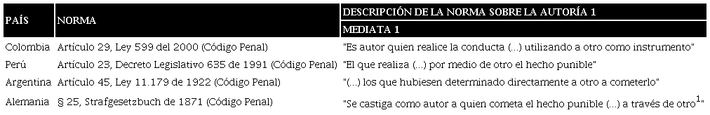 Ahora bien, sentadas las similitudes, reiteramos que la institución jurídica consagrada, expresa o tácitamente, en los códigos penales germánico, argentino, peruano y colombiano, objeto de comparación, es la autoría mediata como forma de intervención delictiva, por lo cual procederemos a exponer la descripción normativa que regula dicha institución en cada ordenamiento.