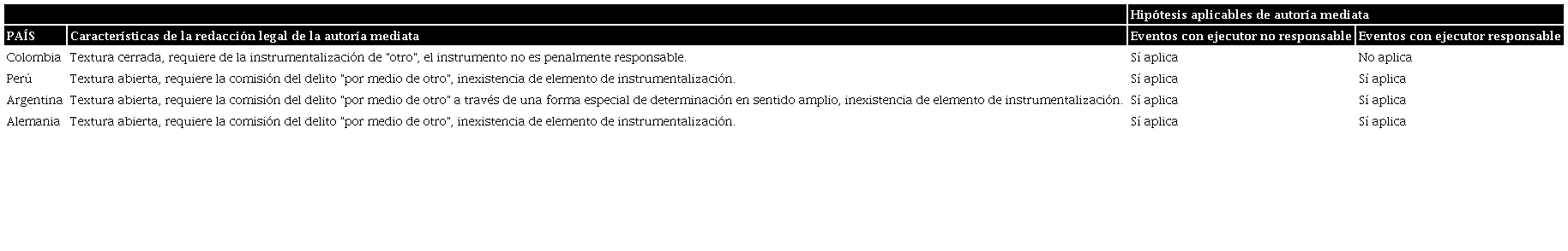Como resultado de la investigación realizada con ayuda de la herramienta del derecho comparado, en la modalidad microcomparación encontramos, en primera medida, que los ordenamientos jurídicos colombiano, peruano, argentino y alemán, aunque a primera vista guarden amplias y marcadas similitudes en tanto a regulación legal de la autoría mediata, presentan hondas diferencias de carácter sustancial, las cuales procederemos a enunciar: (I) a diferencia de lo que ocurre en el ordenamiento colombiano, los demás sistemas no consagran un elemento expreso de instrumentali-zación, siendo entonces la textura de dichas regulaciones principalmente abierta en su redacción; (II) encontramos que, en tanto a la fórmula normativa, los ordenamientos jurídicos peruano y alemán, en su traducción, tienen una regulación legal prácticamente igual, no encontrándose ninguna diferencia marcada, como sí la tienen frente a los ordenamientos colombianos y argentinos; y (III) los ordenamientos peruano y alemán permiten la punibilidad del autor mediato con ejecutor responsable debido a la textura abierta de su norma, mientras que el ordenamiento argentino, aun teniendo igualmente una textura abierta, permite dicha punibilidad a partir de una concepción amplia de la determinación, que engloba tanto los supuestos de autoría mediata como los de inducción, lo que no sucede en Colombia, dado que el texto legal establece como elemento la instrumentalización.