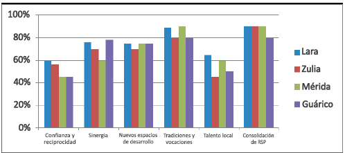 Elaboración propiaLos resultados arrojan que las características de las redes socioproductivas no se encuentran presentes al 100% en las organizaciones rurales estudiadas. El porcentaje de la consolidación de redes socioproductivas más que característica es la aspiración de los productores para conformarlas.