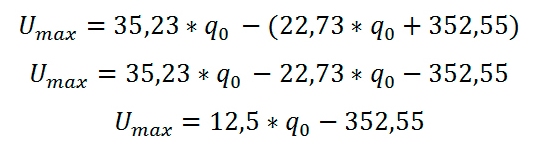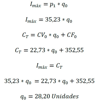 El equilibrio se alcanza cuando Imáx=CT,de donde se obtiene q0=28,20 unidades, que es la posición más favorable, si se producen menos de esta cantidad seguro que la utilidad será negativa. Sustituyendo en Imáx=35,23*q1 el valor de q0=28,20 unidades, se tiene: Imáx=35,23*28,20=993,63 dólares.