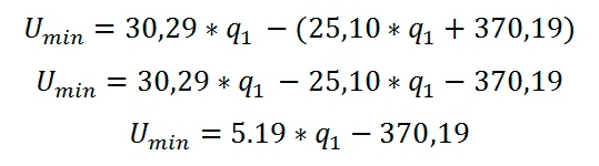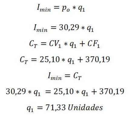 (2)El equilibrio se logra cuando Imin=CT de donde se obtiene q1=71,33 unidades, que es la posición más desfavorable, pero es una valiosa información saber que si se producen más de la cantidad señalada la utilidad seguro es positiva. Sustituyendo en Imin=30,29* q1 el valor de q1=71,33 unidades, se tiene: Imin= 30,29*71,33 = 2.160,51 dólares.