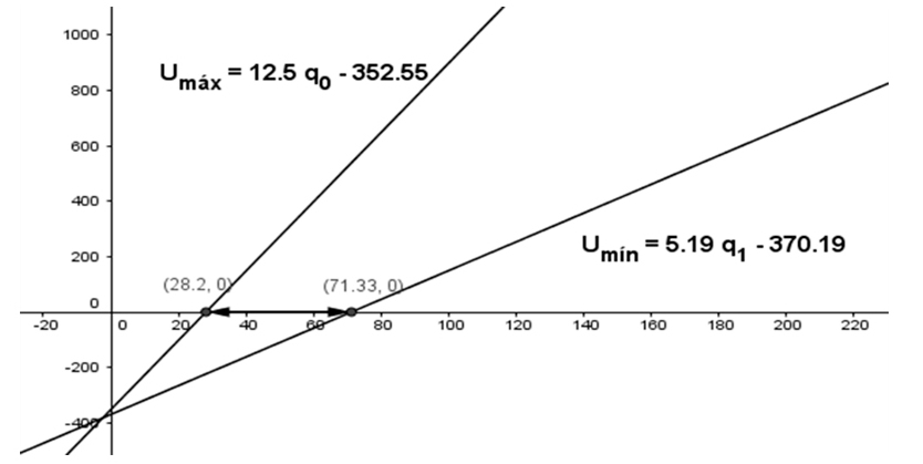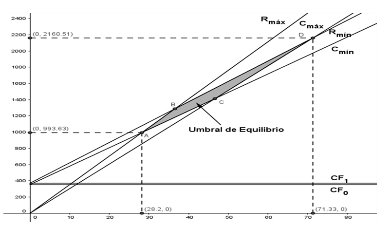 Como se demuestra en el gráfico 1, el umbral de equilibrio está representado por el área del paralelogramo comprendida entre los puntos ABCD, esto quiere decir que el nivel de producción para cubrir los costes estará entre los intervalos [28,20, 71,33] unidades. Paralelamente a este resultado se determinan las funciones de las utilidades mínimas y máximas de la siguiente manera: