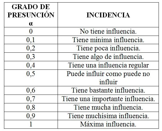 Una de las herramientas más utilizadas de la lógica difusa para reducir la entropía y ajustar los valores examinados es la escalada endecadaria. Kaufmann y Gil (1987:26) expresan: “La introducción de una valuación matizada entre 0 y 1 permite hacer intervenir niveles de verdad en la noción de incidencia. (…) Valores de 0 a 1 (la llamada valuación endecadaria)”. La escala requerida se presenta en tabla 1.