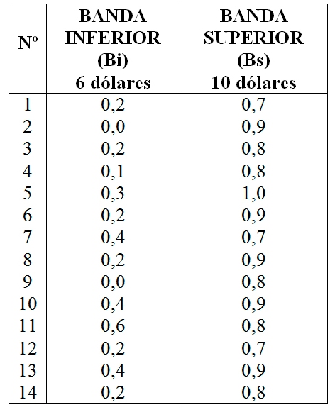 En referencia a la escala endecadaria de la tabla 1, se solicita al grupo de artesanos señalar la incidencia que consideren entre los diferentes valores. A modo de ejemplo se indica los resultados obtenidos respecto a la influencia de la banda [$6, $10], se preguntó: Que influencia tiene el precio unitario que usted paga por un metro de sintético, con relación al precio de 6 dólares, y al precio de 10 dólares. Las respuestas de los catorce encuestados se muestran en la Tabla 2:
