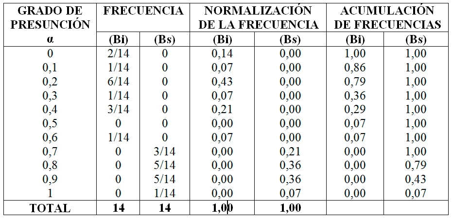 Normalizar la serie es el siguiente paso de esta herramienta, consiste en dividir los valores de frecuencia obtenidos para cada grado de presunción de la escala endecadaria para el número de expertos (14), en cada banda, así para la banda inferior (Bi) el valor 2÷14 = 0,14; 1÷14 = 0,07; y, 6÷14 =0,43, así sucesivamente, igual procedimiento se realiza para la banda superior (Bs). Luego se inicia con la acumulación desde el final de la serie y se detiene hasta que se obtiene el valor de la unidad, de ahí en adelante todos los valores serán uno en cada una de las bandas. Se realiza la sumatoria de la acumulación de frecuencias, sin considerar el grado de presunción α igual a cero, el resultado se indica en la tabla 3.