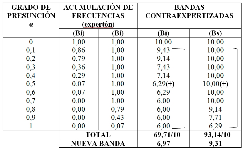 Este procedimiento se aplica para cada una de las filas del grado de presunción, para finalizar se suman las columnas correspondientes a las bandas inferior y superior contraexpertizadas, se procede a dividir entre 10, obteniendo el intervalo [$6,97,$9,31], el cual indica la reducción de la banda en lo que se refiere al precio del metro de sintético. Lo explicado se muestra en la tabla 4.
