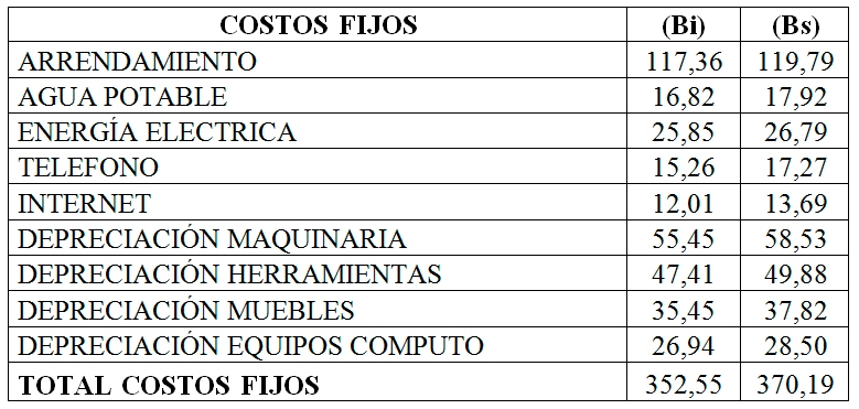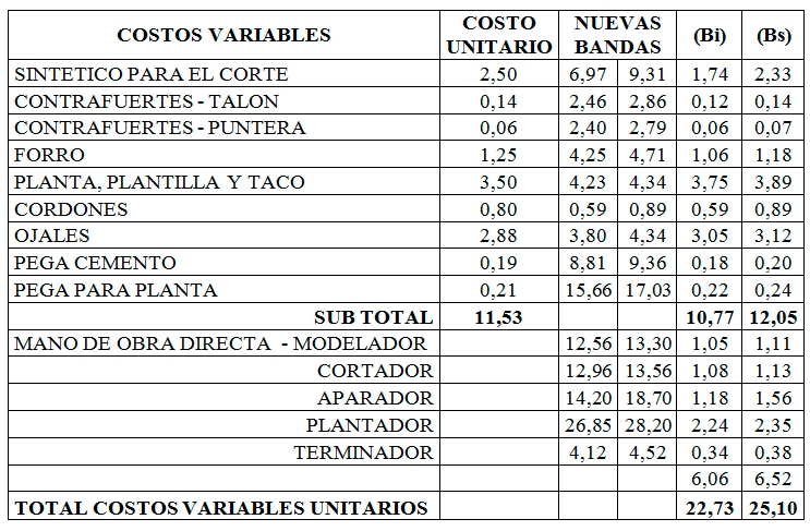 Para determinar el área de equilibrio se han utilizado los datos referentes a la producción dentro de un mes, la cual está representada en la banda [120, 140] unidades, es decir pares de botas para dama, los costos fijos y costos variables unitarios se presentan en las siguientes tablas.