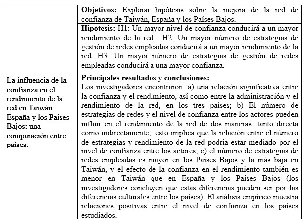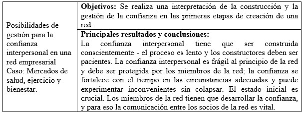 De los factores en pro se seleccionó, para este análisis, la confianza, ya que la misma “desempeña un papel muy importante en los procesos sociales y especialmente en la construcción de relaciones comerciales” (Hakanen y Häkkinen, 2015, p. 250). Asimismo, Klijn, Sierra, Ysa, Berman y Edelenbos (2016) señalan que la confianza reduce la incertidumbre, facilita los intercambios de información y aporta estabilidad a las alianzas entre las empresas lo que permite aseverar que es un componente que potencia el funcionamiento de las redes interorganizacionales. En las siguientes tablas (1, 2 y 3) se muestra la información relativa a tres investigaciones cuyos objetivos y resultados evidencian la importancia de la confianza para el éxito y sobrevivencia de las vinculaciones empresariales.
