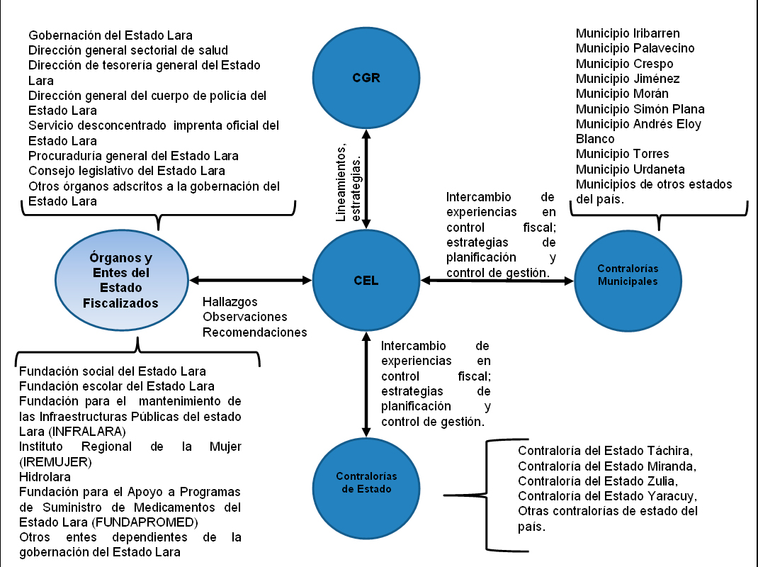 Ubicándonos en la relación gobierno-gobierno del GE, a continuación, se describe la red interorganizacional formada por la Contraloría del estado Lara (CEL) con otros órganos del Sistema Nacional de Control Fiscal (SNCF) (Contraloría General de la Republica, Contralorías de estados, Contralorías municipales) y con los órganos y entes (Pertenecientes a la Gobernación del Estado Lara) a los cuales realiza control fiscal.