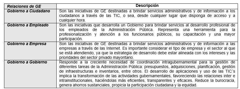 El GE fomenta cuatro relaciones las cuales son descritas en la Tabla No. 1.
