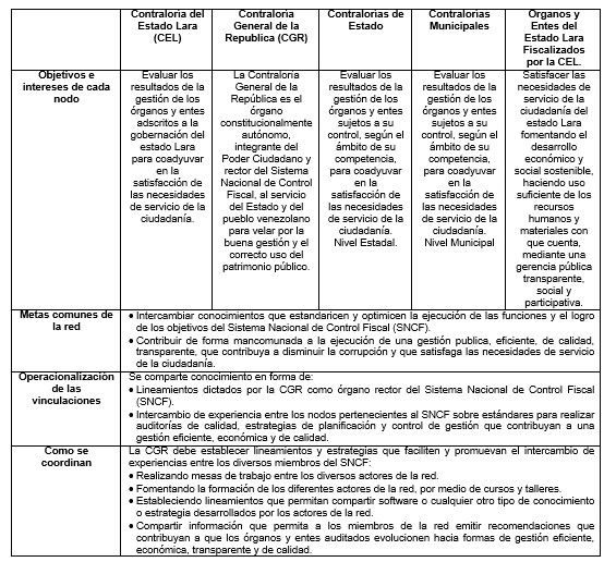 La red interorganizacional descrita muestra por una parte el intercambio de experiencias entre la CEL, las contralorías de estado y las contralorías municipales, en lo que respecta a: