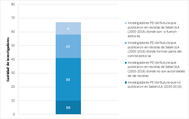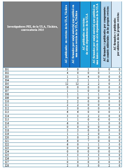 Menos de la mitad de los investigadores acreditados por el PEI-ULA, 2015, hicieron visible su trabajo en revistas fuera del núcleo. En cifras, se trata de un 42 % (28) minoritario del total de los sujetos de estudio; y de ello, el 64 % (18) difundió sus aportas en una sola publicación periódica ajena a la ULA, Táchira.