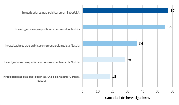Del primer grupo referido, solo dos personas no difundieron sus resultados en algunas de los nueve órganos de divulgación arbitrados y producidos en la ULA, Táchira, frente a una restante y clara mayoría de 55 investigadores. De ellos, 36 lo hicieron en una sola revista del Nutula, es decir, una amplia mayoría del 64 % se decantó por realizar contribuciones en apenas una de entre las diferentes opciones, aun cuando hay multiplicidad de alternativas: por ejemplo, cuatro de esta novena de revistas tratan la educación y la pedagogía, mientras que otras dos abarcan temas disciplinares afines a la geopolítica. En otras palabras, como advierte Cantó (2008), se está ante un abuso de autores que mantienen relación estrecha con algunas publicaciones.