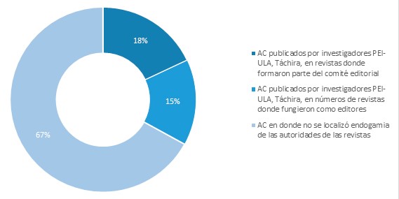 En este orden de ideas, al caracterizar la endogamia en estos productos editoriales, se tiene que el 33 %, de los documentos, se trataron de estudios firmados y publicados por investigadores PEI-ULA, 2015, en medios en los cuales fueron autoridades. En otras palabras, 113 de los 347 AC se produjeron bajo este parámetro: 61 por componentes del comité editorial, de redacción, asesor, entre otros, y 52 por los propios editores responsables de uno o varios números de las publicaciones periódicas (Gráfico 3).