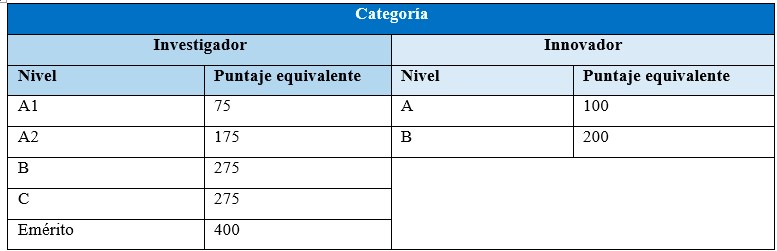Ahora bien, la otra modalidad de acceso al PEI-ULA es la llamada Vía rápida, por medio de la cual cualquiera de los miembros interesados de la universidad, con previa solicitud, piden la incorporación en el programa con solo anexar constancia de su certificación en el PEII-ONCTI del año inmediatamente anterior (cfr. Universidad de Los Andes, 2017). Como se explicó, en este hay diferentes clasificaciones, por eso las equivalencias del puntaje se hacen como se ve en la tabla 1.