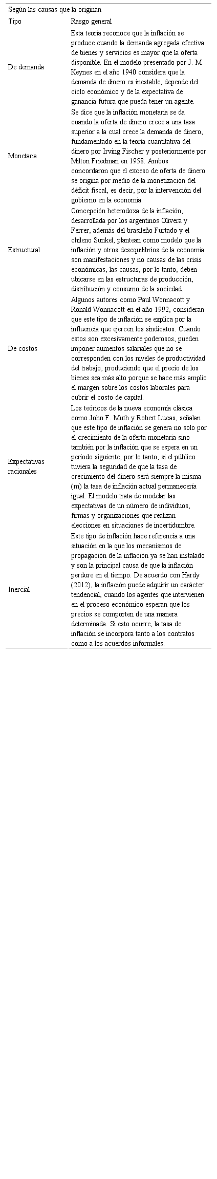 En este sentido, Milanesi (2017) considera que la controversia de los argumentos anteriormente mencionados sirvió de base a pensadores y catedráticos pertenecientes a las diversas corrientes del pensamiento económico para explicar las causas del fenómeno inflacionario. Dichas posturas marcaron la pauta en los planteamientos de estudios subsiguientes, los cuales adaptaron y en algunos casos reformaron las ideas básicas para transformarlas en teorías cónsonas con la realidad que vivían. Es así como se presentan a continuación de forma resumida, la clasificación de la inflación según la base teórica revisada y los fundamentos de cada enfoque que dirimen los postulantes del pensamiento económico: