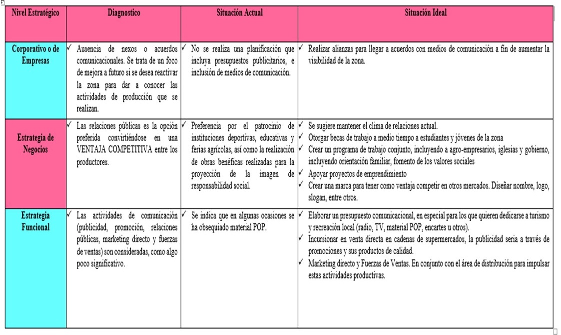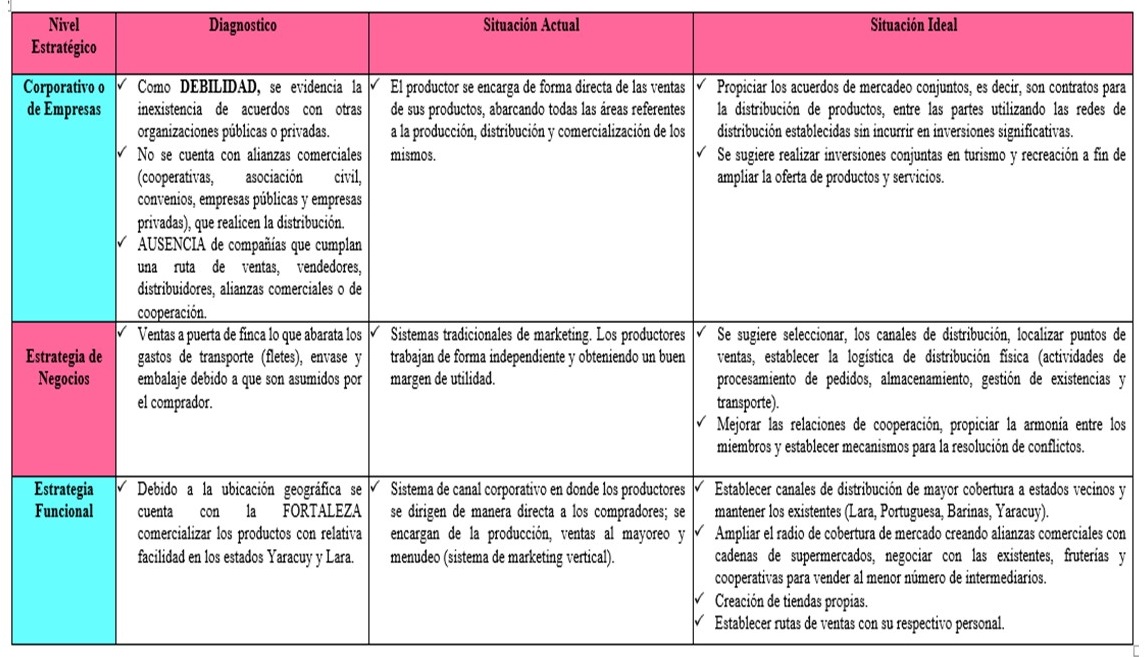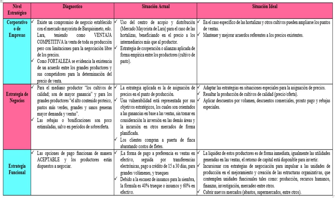 En cuanto a las estrategias de producto, existe predomino a la extensión de líneas de productos/cultivos o servicios adicionales para (medianos y grandes productores). En relación al precio, los márgenes de ganancia son una fortaleza en el cultivo pasto, en el caso de hortalizas y otros cultivos, poseen acuerdos consensuados y los precios dependen de los intermediarios. En la relación precio/calidad los productores poseen criterios productivos personales (cultivo de calidad/mayor ganancia y alto contenido proteico). Los plazos de pagos son óptimos el capital retorna de forma rápida. Por su parte, la principal estrategia de distribución para la venta es el canal directo a puerta de finca, el restante comercializa en MERCABAR. La cobertura de los canales de distribución es limitada, cubre solamente los estados Lara y Yaracuy y no se realiza una adecuada gestión, convirtiéndose en una debilidad. Por último, cabe mencionar que la estrategia de comunicación es inexistente. Esto se evidencia en la ausencia de presupuesto publicitario y de promociones dirigidas a consumidores y distribuidores. Los productores no poseen fuerza de ventas, ni rutas asignadas establecidas representando una debilidad.