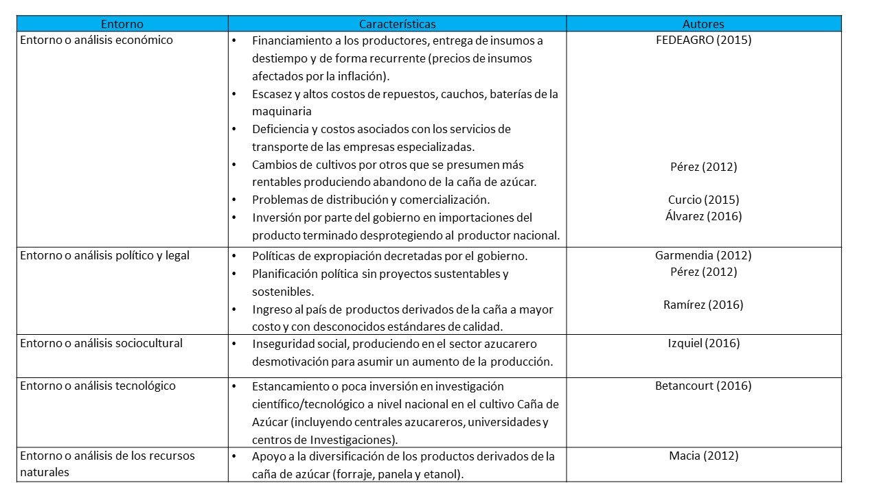 Los productores consideran que los aspectos positivos que predominan en el ambiente de negocio, son: generación de empleos directos e indirectos, grandes extensiones de suelos, creciente demanda y financiamiento a través del sector privado. La dinámica de las organizaciones pertenecientes a este sector es afectada en forma significativa por ciertas amenazas: entrega de insumos a destiempo y de forma recurrente, estancamiento o poca inversión en investigación científico/tecnológica a nivel nacional, inseguridad social en el campo, existencia de competencia territorial, políticas de expropiación de tierras decretadas por el gobierno. Por ello, el ambiente de negocios es percibido como de alta incertidumbre, las oportunidades no son completamente aprovechadas y su estrategia operativa es de sobrevivencia como vía de adaptarse a la crisis.