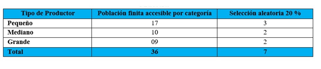 Adicionalmente, se seleccionó la muestra por medio de la técnica del muestreo aleatorio (Ortíz, 2004). El criterio seleccionado para obtener la proporción de la muestra es el de población finita accesible (Arias, 2006), en la cual el tamaño de la población accesible depende del tiempo y de los recursos del investigador. Es recomendado su uso para las investigaciones que no cuentan con financiamiento, lo cual facilita la determinación de un tamaño de muestra adecuado y ajustado a la disponibilidad de tiempo y recursos. El autor mencionado indica que en investigaciones descriptivas, se recomienda seleccionar entre 10% a 20% de la población accesible e incluso hasta un 30%, así se utilizó un porcentaje del 20%. Sumado a esto la situación de inseguridad en el medio rural hace complicado que los productores accedan de manera espontánea a participar como informantes. Estas razones refuerzan el criterio de selección. La muestra la componen pequeños productores con (0-10 has), medianos productores (entre 10-50 has) y (> a 50 has) son grandes productores, según los criterios establecidos entre especialistas de caña de azúcar pertenecientes al INIA y Azucarero Río Turbio C.A. Para ello se ordenó la información estableciendo los siguientes criterios muestrales: