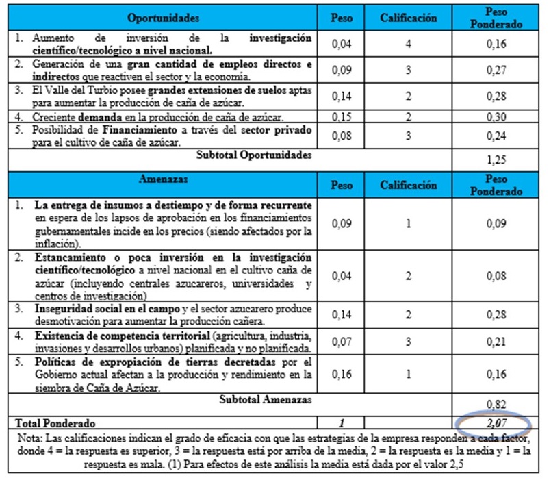 El promedio ponderado que arrojó este estudio fue de 2,07; tal y como lo indica David (2003), independientemente de la cantidad de oportunidades y amenazas clave incluidas en la matriz EFE, el valor del promedio ponderado es 2,5; un total menor a este, indica que, las respuestas ante las amenazas no son las más beneficiosas para estos productores. Es importante destacar que presentan vulnerabilidad ante la problemática de la inseguridad social, existencia de competencia territorial y políticas de expropiación de tierras decretadas por el ejecutivo nacional. Por otro lado, se puede apreciar que las respuestas ante las oportunidades se enfocan hacia las situaciones orientadas específicamente al factor económico: aumento de la inversión en investigación científico/tecnológico a nivel nacional, debido a que impulsaría el rendimiento del cultivo, lo cual generaría una gran cantidad de empleos directos e indirectos que reactiven el sector y, por último, la posibilidad de financiamiento a través del sector privado además de las políticas de la banca privada, todo esto generaría unas condiciones hacia la sustentabilidad de este cultivo.