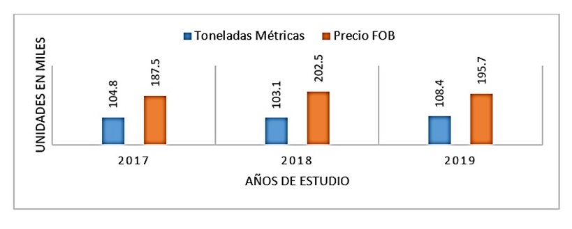 Basándonos en las cifras del Banco Central del Ecuador y según lo representado en la figura 5, las exportaciones de mango o mangifera indica l. (por su nombre científico) con su respectiva partida arancelaria número 0811909100, refleja una cantidad de tonelada y en valores en dólares estable en el trienio del 2017 al 2019, mientras los datos del 2020 que al momento de escribir este artículo no se exponían en la entidad mencionada, pero según datos extraoficiales las exportaciones se mantuvieron, pese al año de pandemia generada por Covid 19, y que su producción estuvo ligada a los cambios climáticos y también al tratamiento de los suelos que son las ventajas comparativas aprovechadas por el país (Banco Central del Ecuador, 2020).