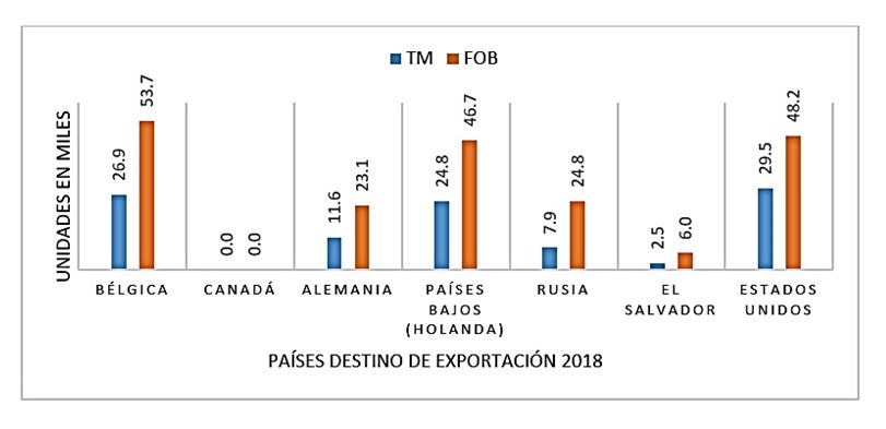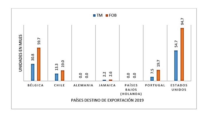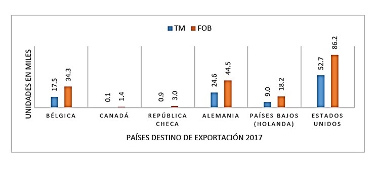 En las figuras 6,7 y 8 se muestran las exportaciones del mango por país desde 2017 al 2019 en miles de dólares el valor del Free on Board (FOB) y toneladas métricas. Los países a los que Ecuador ha destinado su oferta exportable de mango en estos últimos años son: los Estados Unidos como el principal comprador de este producto, seguido por Alemania, Bélgica, Países Bajos, Canadá, República Checa, Holanda, Portugal, Rusia, Chile y Jamaica (Banco Central del Ecuador, 2020). Tendencia que se viene manteniendo y aprovechando los acuerdos comerciales, además de las estrategias de exportación de los productores. En los países antes mencionados, el negocio de los mangos se mueve en función de las temporadas de cosecha o estacionalidad de los países productores como ejemplo, se puede citar el caso de Brasil que cuando este termina de colocar su producción, en los mercados que comparte con los otros países productores como Ecuador y Perú estos cubren estos mercados, manteniendo de esta manera su precio. El principal mercado de Ecuador es Estados Unidos, hacia este país se exporta el 80% de la producción ecuatoriana de mango. En los tres últimos años, ha sido variada su exportación a Europa donde se destacan Bélgica, Alemania, Portugal, y Países Bajos (Banco Central del Ecuador, 2020).