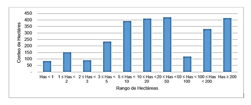 La Figura 1 muestra el tamaño de los cultivos más frecuente en la producción del mango en los campos sembrados en Ecuador, se muestran los cultivos que van desde las 20 hasta las 50 hectáreas. Adicional, se pueden encontrar aquellos que sobrepasan las 200 hectáreas y aquellos que están en el rango de 10 a 20 hectáreas, por otro lado, los tamaños de cultivo que se utilizan de menor manera son aquellos menores a 1 hectárea, los que están entre 2 y 3 hectáreas y aquellos que van de 50 a 100 hectáreas. En ese sentido, se percibe que los productores de mango prefieren invertir en tamaños de cultivos más grandes con la finalidad de reducir los costos de producción obteniendo así más ingresos por hectárea cultivada.