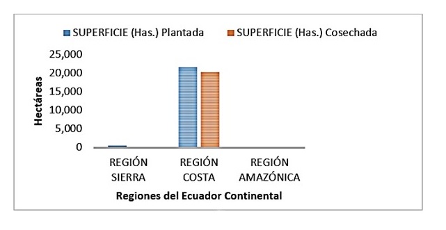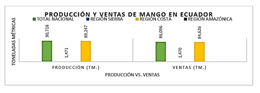Según se muestra en la figura 4, la región costa es la que destina más hectáreas al cultivo y que además es la que más producción en toneladas métricas genera en el país. El Instituto Nacional de Estadísticas y Censos (INEC) en el 2016, presentó a la provincia del Guayas con la mayor superficie de mango en comparación con el resto de las provincias del país, con aproximadamente 20 400 Has de superficie plantada y 16 737 Has de superficie cosechada. La producción total en toneladas para el año 2016 de Guayas fue de 80 834 toneladas métricas y las ventas al exterior estuvieron en 78 261 toneladas.