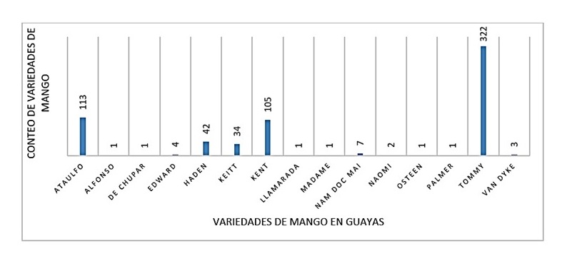 Según la Fundación Mango Ecuador (2018) la principal provincia que cultiva mango de exportación es Guayas, con aproximadamente 7700 hectáreas, de las cuales aproximadamente 5600 se destinan a la exportación. Según la figura 3, la principal variedad de mango que se cultiva en esta provincia es el Tommy, seguido por las variedades Kent, Ataulfo, Haden, Keitt, Nan Doc Mai, Edward y Van Dyke.