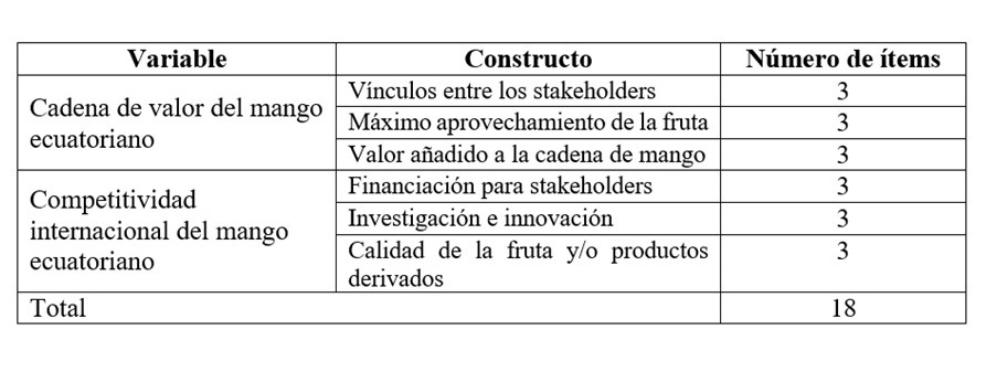 De esta forma, se considera necesaria la presente investigación que tiene como finalidad analizar la relación de las variables que existen entre la cadena de valor del mango ecuatoriano y su competitividad internacional, esto se llevará a cabo mediante una revisión teórica y una encuesta con escala de Likert a los actores de la cadena logística del mango siguiendo la metodología de (Prasad & Hambly, 2012). Este estudio se encuentra estructurado así, (1) una revisión teórica del mango en el contexto ecuatoriano, (2) la presentación de aspectos metodológicos para estipular los constructos comprendidos en esta investigación, (3) una sección de resultados que mostrará el análisis estadístico de las variables y comprobación de hipótesis a través del chi-cuadrado y (4) las conclusiones referentes a los resultados obtenidos y a la revisión teórica.